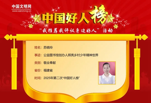 苏晓玲,女,1981年2月生,中共党员,福建省南安市图书馆阅读推广活动部负责人、“好读书”公益图书馆创办人。十余年来,苏晓玲与同伴们深耕公益图书领域,齐心协力在南安市成功筹建并运营了28家“好读书”公益图书室。他们举办了超过一千场阅读活动,累计帮扶了八万多名青少年,用知识为无数孩子开启了智慧之门。目前,这28家公益图书室总面积超过4500平方米,藏书总量已达13万余册,年均接待读者超过25万人次。苏晓玲曾获乡村阅读推广人、福建省全民阅读优秀阅读推广人等荣誉。