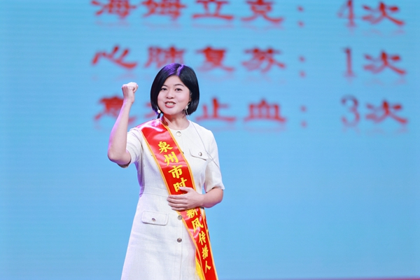 活动现场,首场宣讲拉开帷幕,6名各类别的先进典型代表一一上台宣讲,他们发自肺腑、感人至深地分享自己的心路历程,感动了在场的每一位观众。2024年度中国好人、泉港区星空应急救援中心主任詹惠阳讲述了自己从一名军人化身为守护家乡、救危援难的英勇事迹;惠安县惠东实验小学团支部书记刘婷瑜分享了全国优秀共产党员、首届福建省道德模范陈欠水事迹,她用动听的言语讲述着老陈扶贫助弱,照亮无数青年前行的善行善举;第七届全国道德模范提名奖获得者、2009年度中国好人,晋江市深沪镇后山社区党总支组织委员、宣传委员吴奕澈讲述了本人在危机时刻挺身而出,多次勇救落水群众于险境的义举;第一届福建省文明家庭、2015年度福建好人、永春县“红玫瑰早教公寓”银发先锋公益早教工作室创始人郑民红分享了她与公益结缘,点亮孩子成长之路的暖心故事;第六届鲤城区新时代好少年林书睿分享了自己一步步蜕变成长的精彩故事;第六届泉州市道德模范、2019年度福建好人、丰泽区实验幼儿园教师林珍珍用自身经历讲述了与急救知识紧密相连的成长经历。