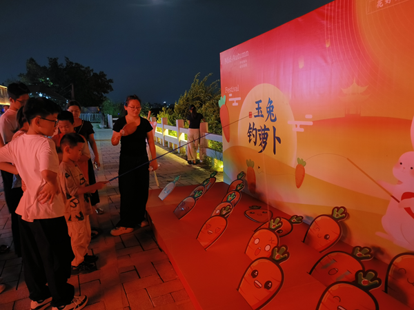活动现场精心打造“后羿射日”“玉兔垂钓”“投壶射礼”等多个互动体验区。其中,最受欢迎的莫过于“中秋博饼”环节,参与者手持集满印章的游园卡,个个摩拳擦掌、跃跃欲试。骰子落碗的清脆声响此起彼伏,现场气氛一次次被推向高潮。伴随着阵阵欢呼与笑声,幸运儿们抱着精美礼品满载而归,也将这一晚的热闹与喜悦,带回了生活的每个角落。