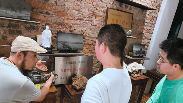 在影雕体验环节,国家工艺美术大师李幼琴老师现场示范,从影雕的工具使用到技法要领,逐一讲解并手把手指导。参与者根据老师教授的方法,在石板上一针一针仔细地雕琢。在互动实践中,非遗影雕不再只是展柜中的艺术品,而是成为可触摸、可创造的文化载体。国家工艺美术大师、洛阳镇万安村文化特派员杨庆聪老师则为来到洛阳桥的游客们仔细讲解石雕作品背后的含义,让他们能够深入感悟非遗石雕艺术的千年沉淀。