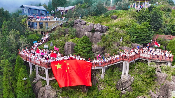 “五星红旗迎风飘扬,胜利歌声多么嘹亮。”上百名徒步爱好者统一着装,手持鲜艳的五星红旗,沿着精心规划的路线前进,在途中感受山清水秀,用歌声向祖国祝福。