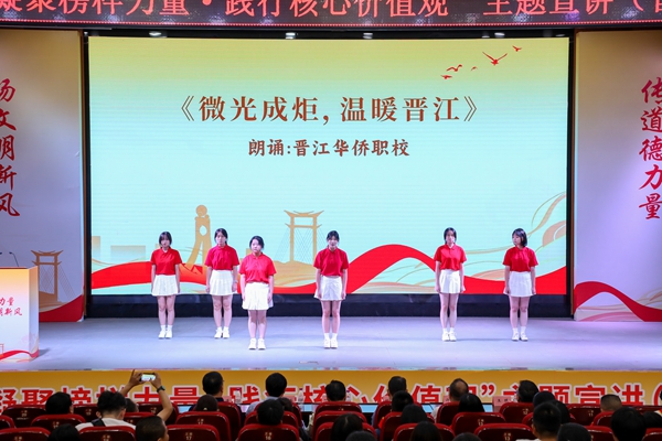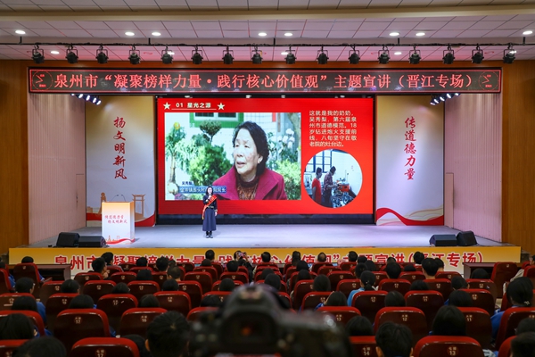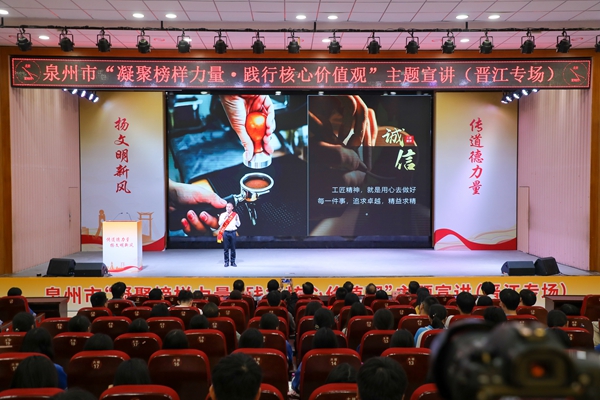 为深入学习宣传贯彻党的二十届四中全会精神,着力培育担当民族复兴大任的时代新人,宣扬助人为乐、见义勇为、诚实守信、敬业奉献、孝老爱亲 等道德典型的崇高精神,在全社会形成学习、关爱、崇尚、争当先进典型的浓厚氛围,11月6日,由泉州市委宣传部、泉州市委文明办、泉州市委讲师团、晋江市新时代文明实践中心等单位联合主办的“凝聚榜样力量·践行核心价值观”主题宣讲活动在晋江华侨职校举行。